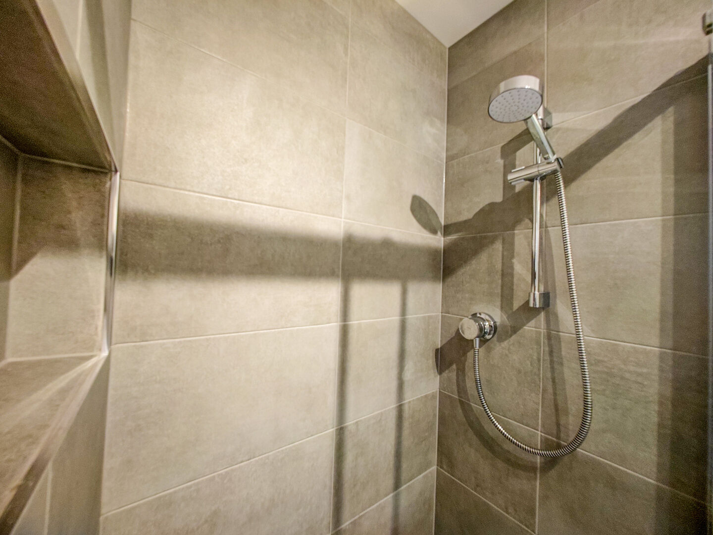 Master Suite: A stylish contemporary en-suite complements the master bedroom, complete with alcove storage shelves and ample wardrobe space. Window blinds add to the room's privacy and aesthetic appeal.