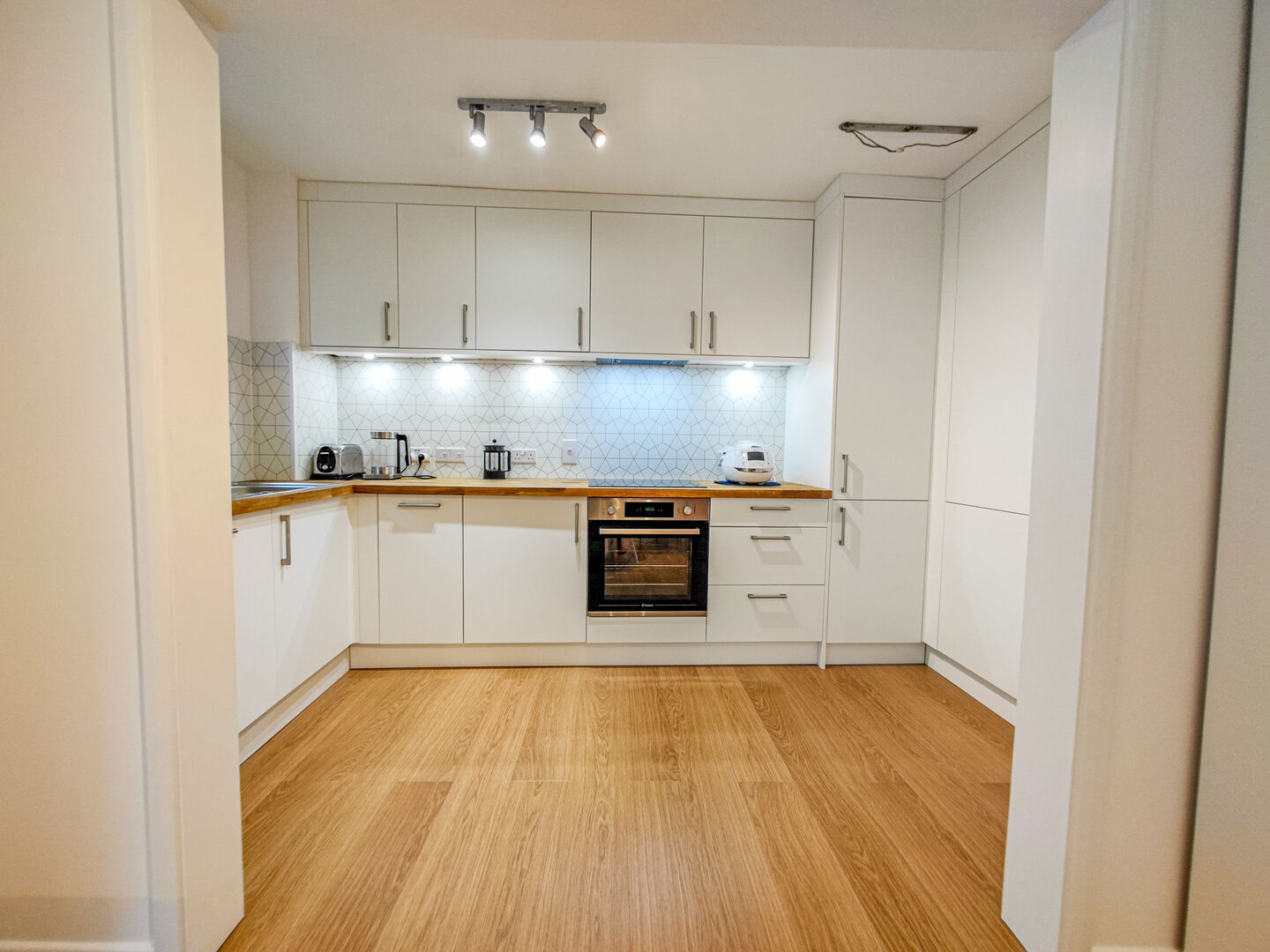 Modern, Semi-Open Kitchen: Seamlessly connected to the living room, the kitchen features new integrated appliances, including a large fridge/freezer, dishwasher, and a washer/dryer combo. The design maximizes storage and is complemented by an attractive, easy-to-clean splashback and wooden worktops.