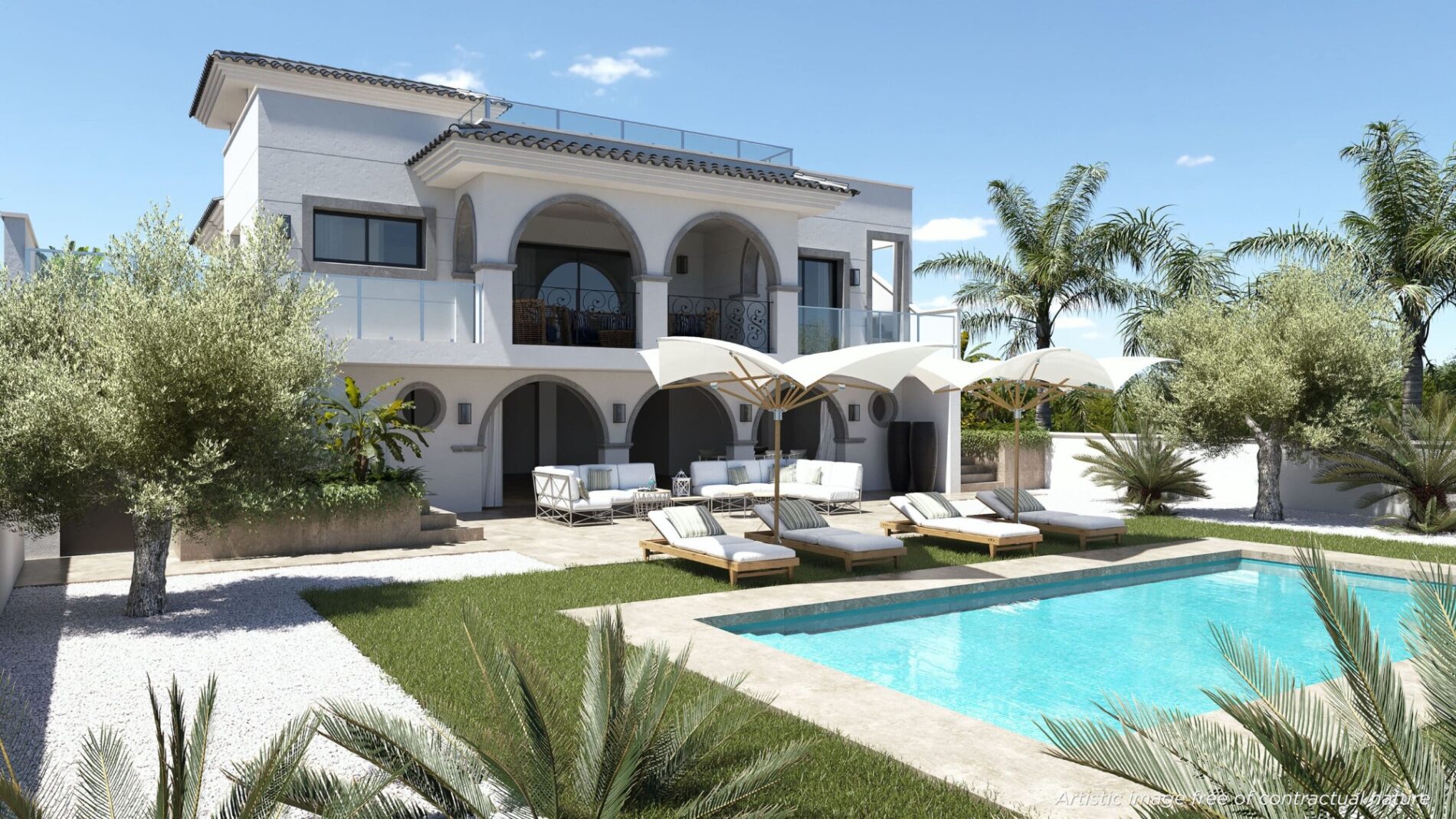 This luxury villa is built all on one level and includes a private pool, all kitchen appliances, hot/cold air conditioning, under floor heating in the bathrooms, rooftop solarium and private parking.
