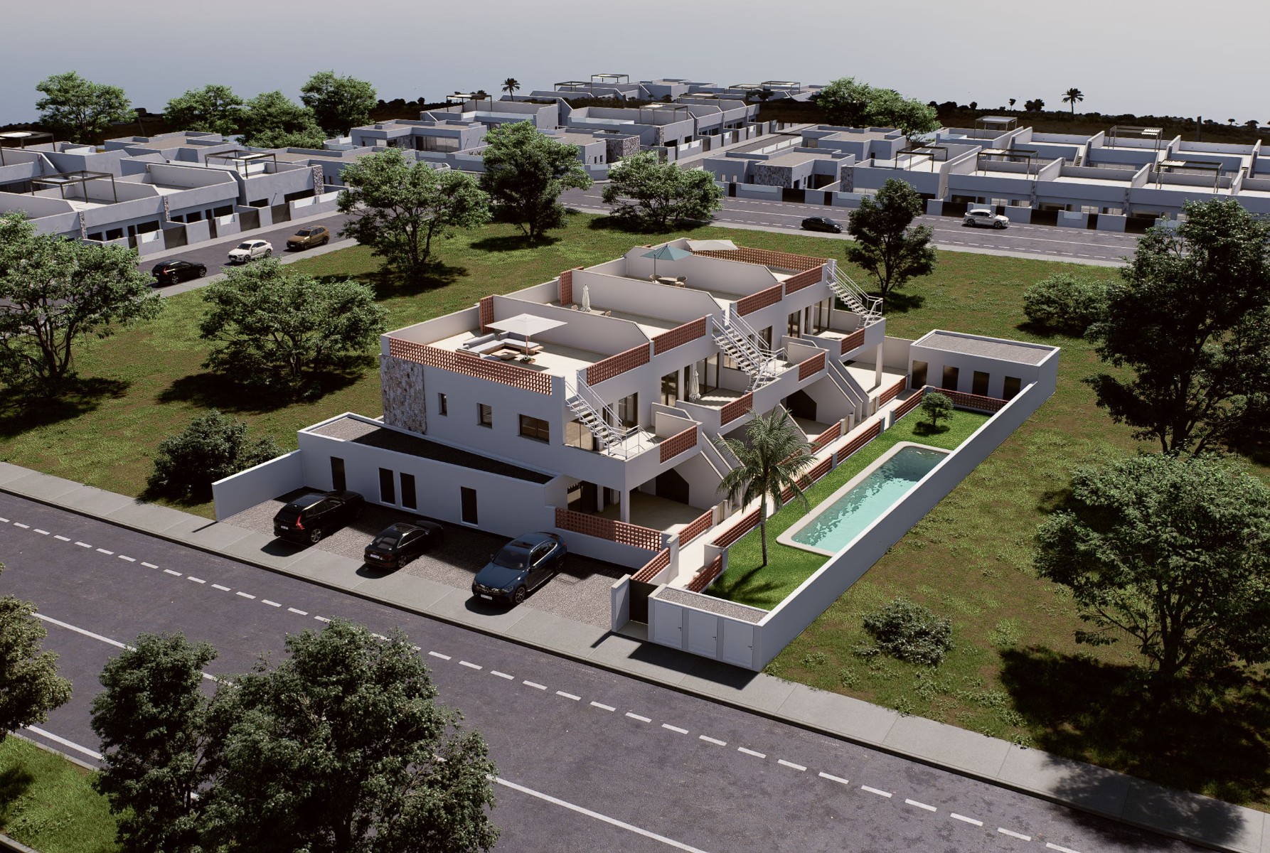 This a secure gated complex with landscaped gardens, communal swimming pool and private parking with storage room. There are ground floor apartments with private garden and penthouse properties with private rooftop solarium.