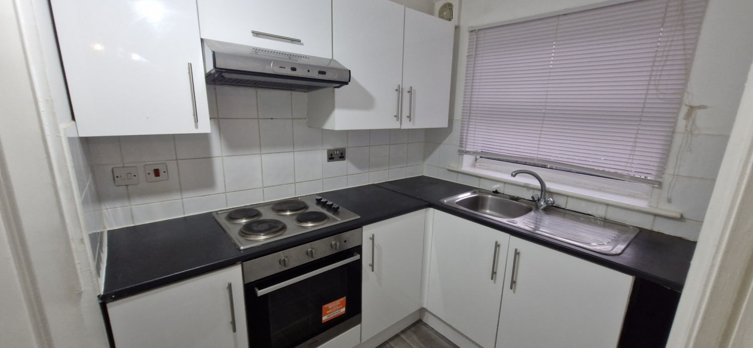The modern fitted kitchen is equipped with essential appliances including an oven, hob, fridge/freezer, and washing machine, ensuring convenience for daily living.