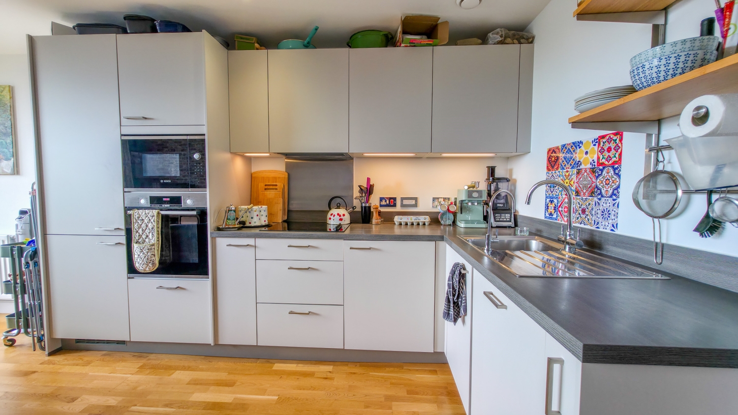 The property features two well-proportioned bedrooms, with bespoke finishes, ample storage, and large windows that enhance the bright and airy feel. A contemporary kitchen is fitted with high-quality integrated appliances and sleek cabinetry, while the bathroom offers a luxurious touch with modern tiling and designer fittings.